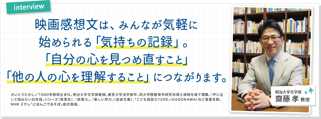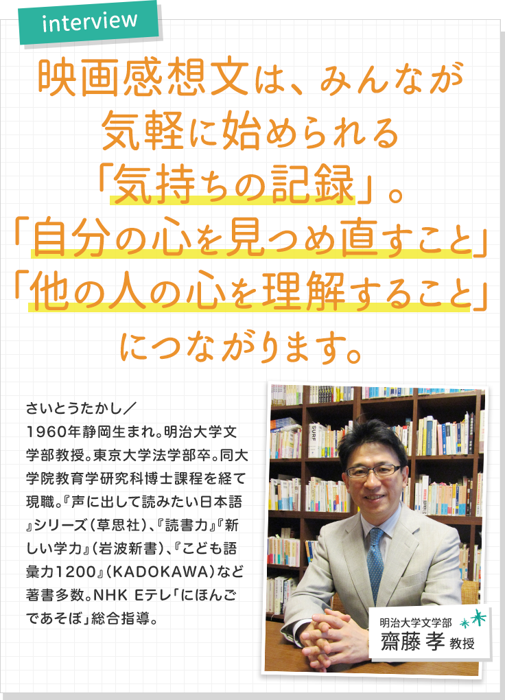 映画は、生きていく世界をさらに濃く広げるものであり、スケールも大きいので、この世に生きている意味というものを学ぶのにすごくいい教材だと思います。子どもの時に見ると世界が広がります。その気持ちを、誰かに話すように文章で書くことで、見た意味を自分でもちゃんとつかまえることができるというのが映画感想文の良さ。ぜひ! おすすめです。