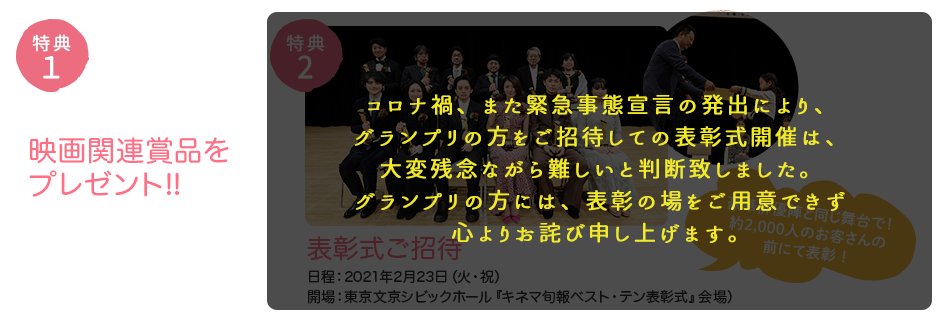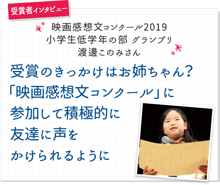 「2019年 第93回キネマ旬報ベスト・テン」の表彰式とともに、「映画感想文コンクール2019」のグランプリ授賞式が多くの俳優、女優、映画監督の皆さんと同じ舞台、東京・文京シビックホールにて2月11日に開催されました。緊張の授賞式のあと、『トイ・ストーリー4』の感想文で選出された小学校1年生の渡邊このみさんとご家族にお話しをお伺いすると「お姉ちゃんが映画感想文コンクールに参加しているのを見て応募してみようと思いました」とのこと。実はお姉さんのこころさんは2016年の大阪府低学年の部で最優秀賞、そして2018年、引っ越し先の神奈川県大会で優秀賞を受賞した、まさに映画感想文コンクール姉妹! バイオリンの発表会で人前に立った経験もあるこのみさんですが、2,000人もの観客の前でおしゃべりするのは初めて。とても緊張したようです。しかし、それを観客席から見守っていたお父さんとお母さんは「人前に出るのが苦手な子なのに、意外と壇上でリラックスしていてよかったです」と顔をほころばせ、「映画感想文を書いたことで、トイ・ストーリーに出てくるギャビー・ギャビーと自分を重ねることができたのか、小学生になって世界が急に広がったときに、引っ込み思案だった子が積極的に友達になろうと声をかけられるようになりました」と教えてくれました。最後にこのみさんに、これからも映画感想文コンクールに参加してくれますか? と尋ねると、はにかんだ笑顔で「はい!」と元気よく応えてくれました。そんなこのみさんをはじめ、2019年グランプリ受賞のみなさんの感想文はコチラからご覧いただけます。ぜひ、ご一読を!