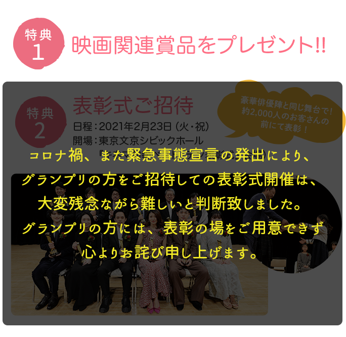 • ③応募票に記入された感想文題名・映画名および氏名・学校名・学年と入賞作品を含むすべての応募作品は主催者の刊行物やwebサイトのほか、テレビ、ラジオ、雑誌、書籍、教材、店頭POP、出版物等各種媒体で使用・公表することがあります。ご了解のうえ、ご記入ください。