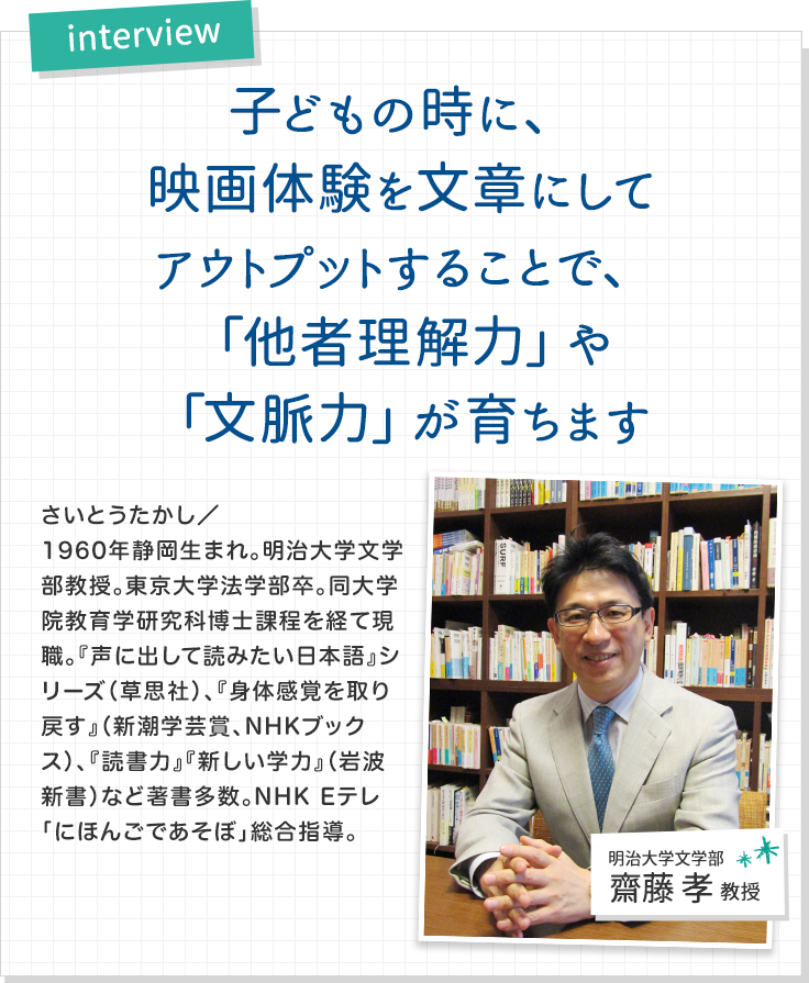映画はエンタテインメントという楽しみですが、自分の感情を文章にすることでしっかりとした「意味」として残るもの。子どもの時に経験することですごく世界が広がるので、ぜひ、お薦めします。