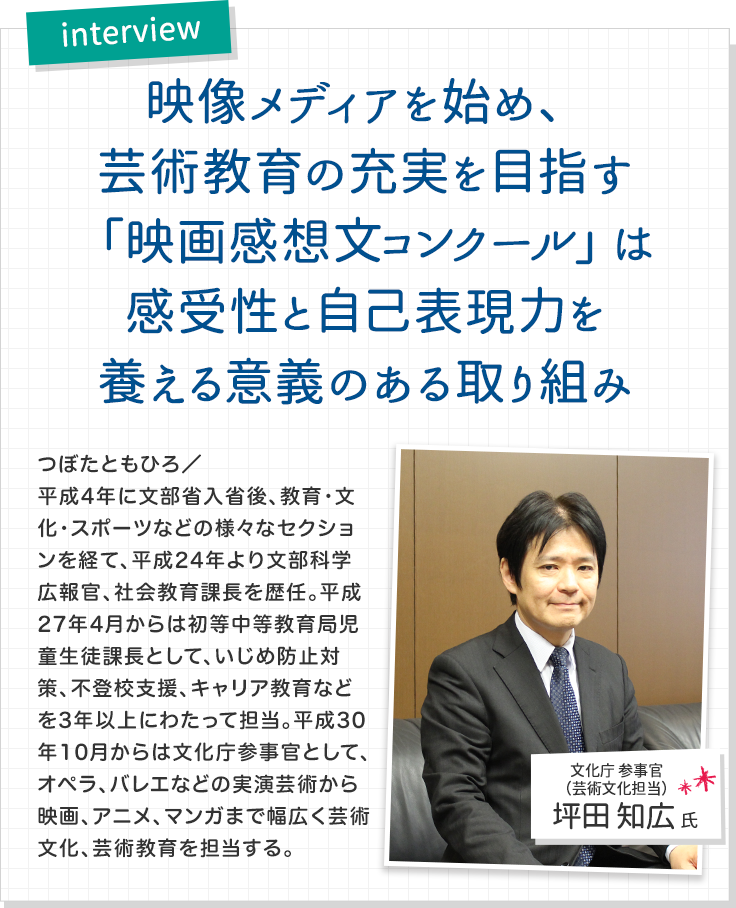 今後は、子供たちが普段から芸術に触れ、楽しめるような素養を育成していくことが重要だと思います。そして子供たちが芸術に親しみ、自己表現力を高めていくことができる取り組みのひとつとして、「映画感想文コンクール」にも非常に意義を感じております。映画を観てどのように感じたのかを考え、言葉にすることは、感受性を養うことにも繋がったりするかもしれません。人の弱さや強さを描いている作品を見て自分に自信が持てるようになるかもしれないし、ヒーロー映画に勇気づけられることもあるかもしれません。そんな気持ちの変化が生じることによって子供たちの抱える問題も減っていくでしょうし、子供たち全体に良い効果をもたらすことができるのではないかと期待しています。