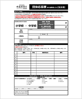 団体応募の際に使用します。必要事項を記入し、『応募票(生徒用)』を添付した各感想文と一緒にお送りください。