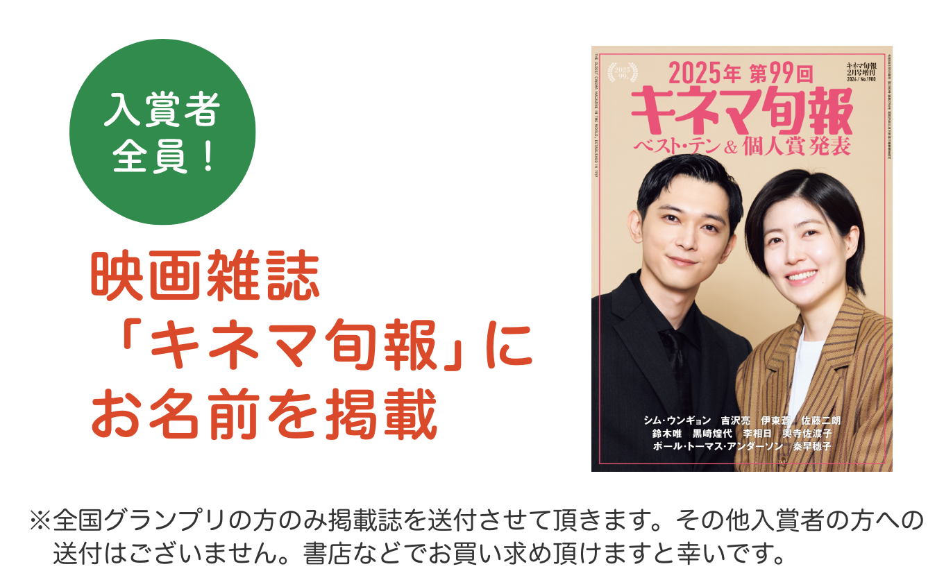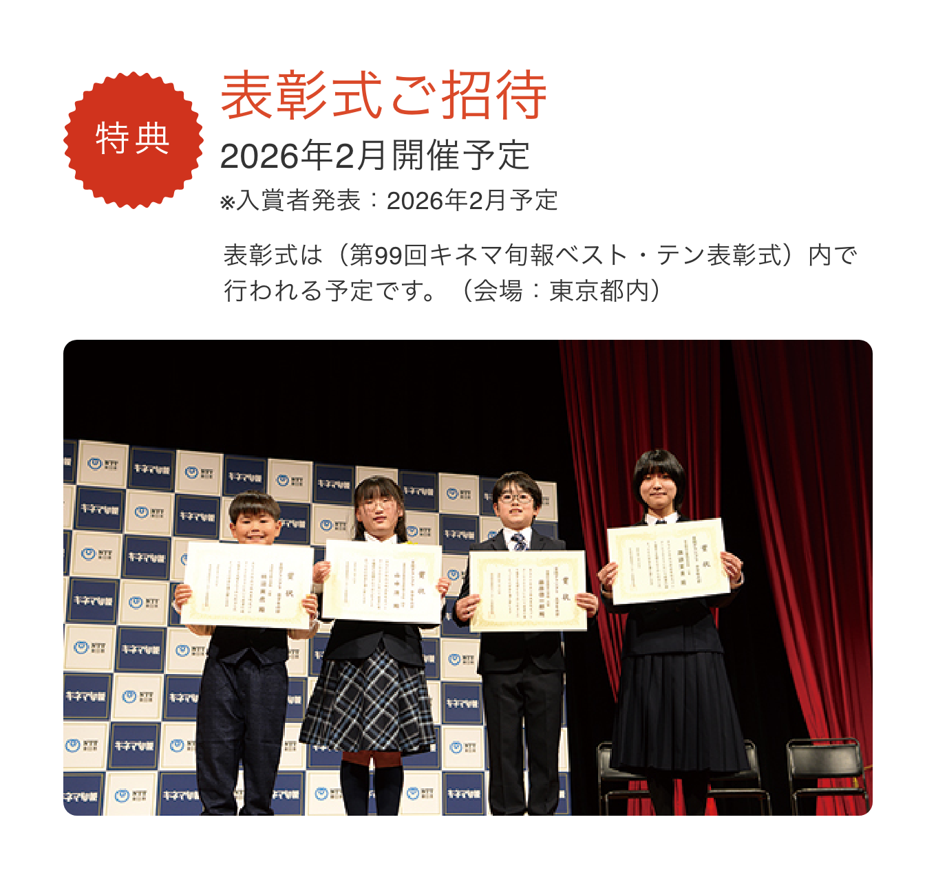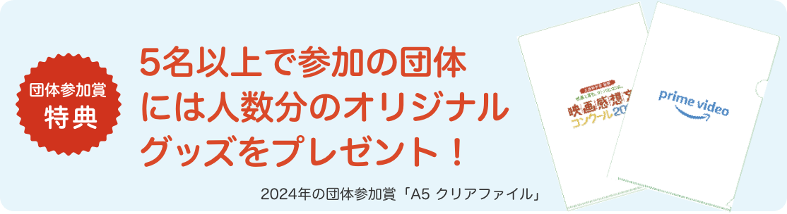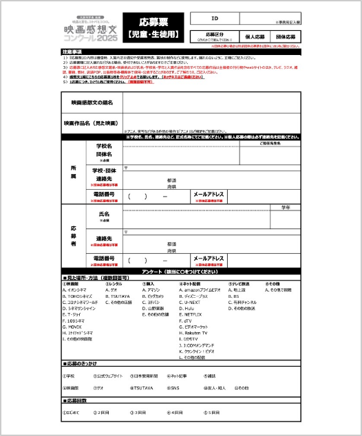 - ④応募票に記入された感想文題名・映画名および氏名・学校名・学年と入賞作品を含むすべての応募作品は主催者の刊行物やwebサイトのほか、テレビ、ラジオ、雑誌、書籍、教材、店頭POP、出版物等各種媒体で使用・公表することがあります。ご了解のうえ、ご記入ください。