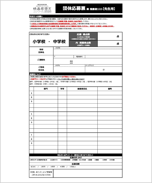 団体応募の際に使用します。必要事項を記入し、『応募票(生徒用)』を添付した各感想文と一緒にお送りください。