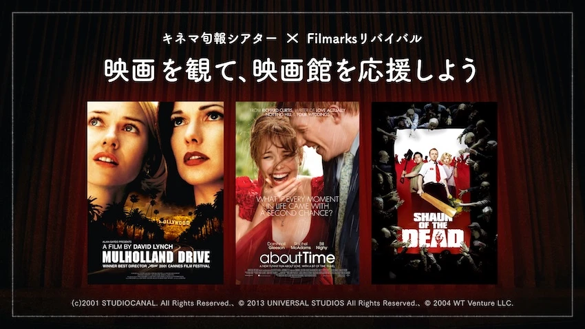 Filmarksリバイバルでキネマ旬報シアター応援企画を実施。「マルホランド・ドライブ 4Kレストア版」「アバウト・タイム 愛おしい時間について」「ショーン・オブ・ザ・デッド 4K」を12/6より順次上映