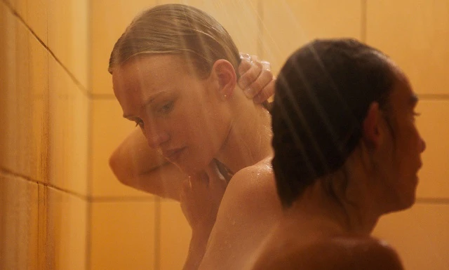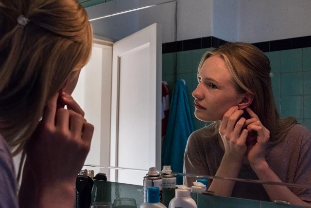 かたやドンの映画はドキュメンタリー然とポルスターの演技を超えた佇まい、さらには肉体そのもののありさまを掬い上げていく。トウシューズを脱いではがされるテープ、血まみれのつま先の赤。レオタードの下の性器のふくらみを押さえつけるテープをはがすとその肌が鞭打たれたように赤く染まっている。そこで目を撃つ痛み。蛇口で水を含み、高窓に風を呼んで耐えるララを苛む肉体的な痛みが心のそれをも射抜き、ひりひりと見る目にも沁みてくる。そうやって日々繰り返される苦闘を記録する映画にやがて痛みの記憶を背負い込むように赤バックの場面がじわじわと増殖していくことも見逃せない。そうして開幕部分、諌める父をしり目に「もう遅い」と望み通り耳にピアスの穴をあけていたララが静かに選ぶデスパレートなその先の一歩――。
