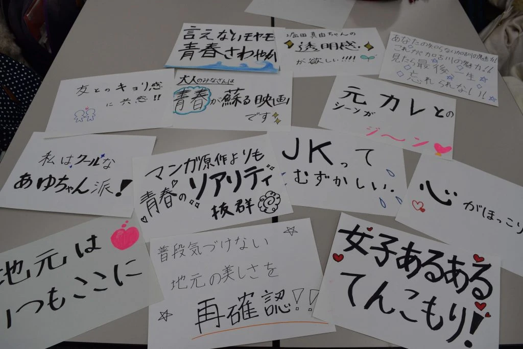 地元イオンシネマ加古川の上映では、彼らも舞台挨拶に登壇してもらいました。上映が終了した翌月、最後のワークショップを行ったんですが、これからは全く加古川に興味がない人たちに映画を届けよう。その人たちにどういうポイントで映画を勧めたらいいと思うか、一緒に考えたんです。そのときに皆から出た意見がこれです。