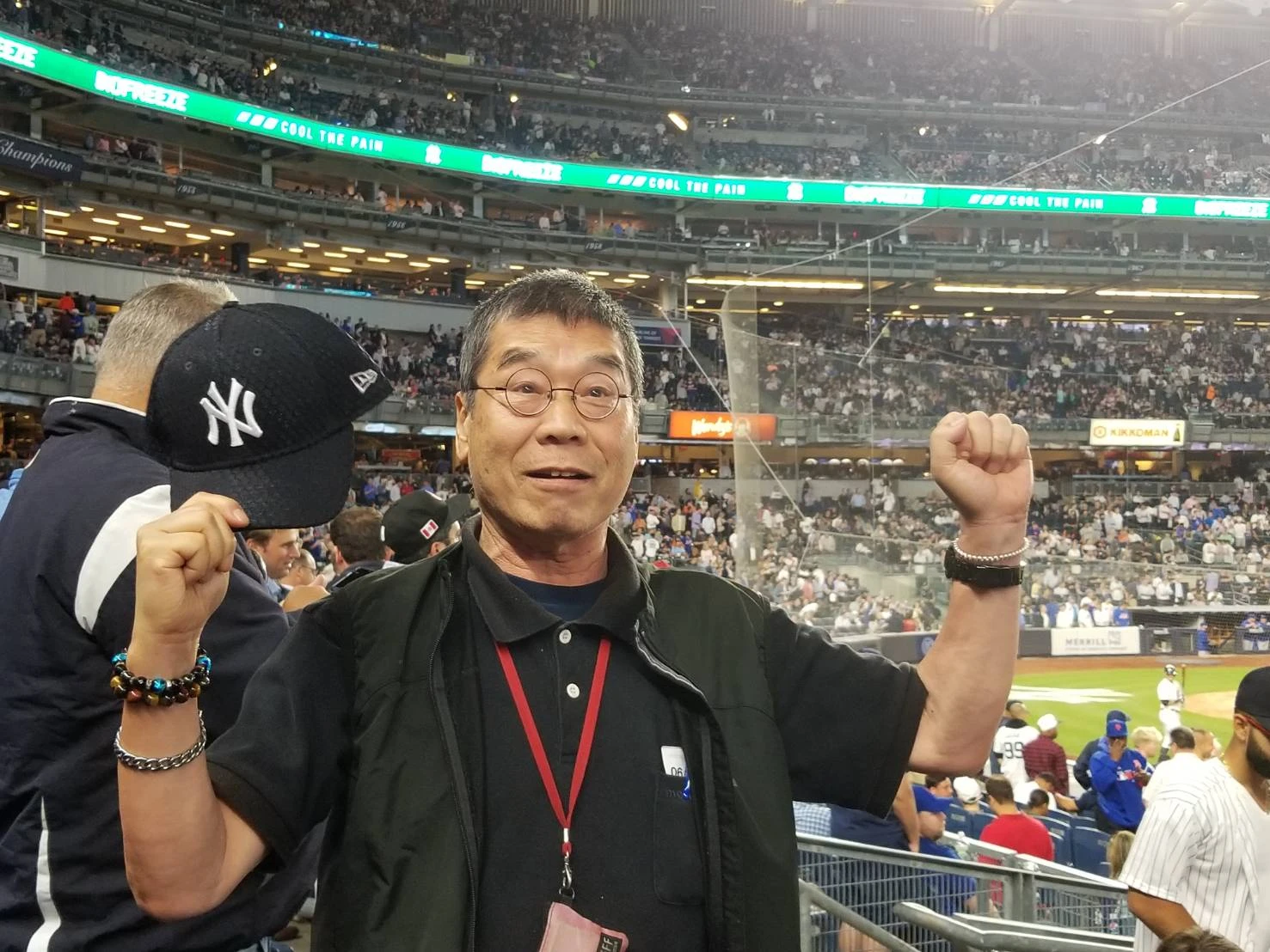初めて訪れるヤンキー・スタジアム。でっかい!私たちに用意してくれたのは、ニューヨーク・ヤンキースのブルペンの上のほうの、まさに上等な席。ここから見るスタジアムの全景を私は生涯忘れないだろう。おう! スペクタクル! と思わず口にした。夕方、日が暮れようとしている試合に頭の上から煌々と照らし出された照明の眩しさ。いつもTVでしか観戦してなかったが、実際に身を置いてみると、球場の立体感が、すごくリアルに感じられて圧倒された。観客たちの熱気でエネルギーがムンムンと立ち上っていた。