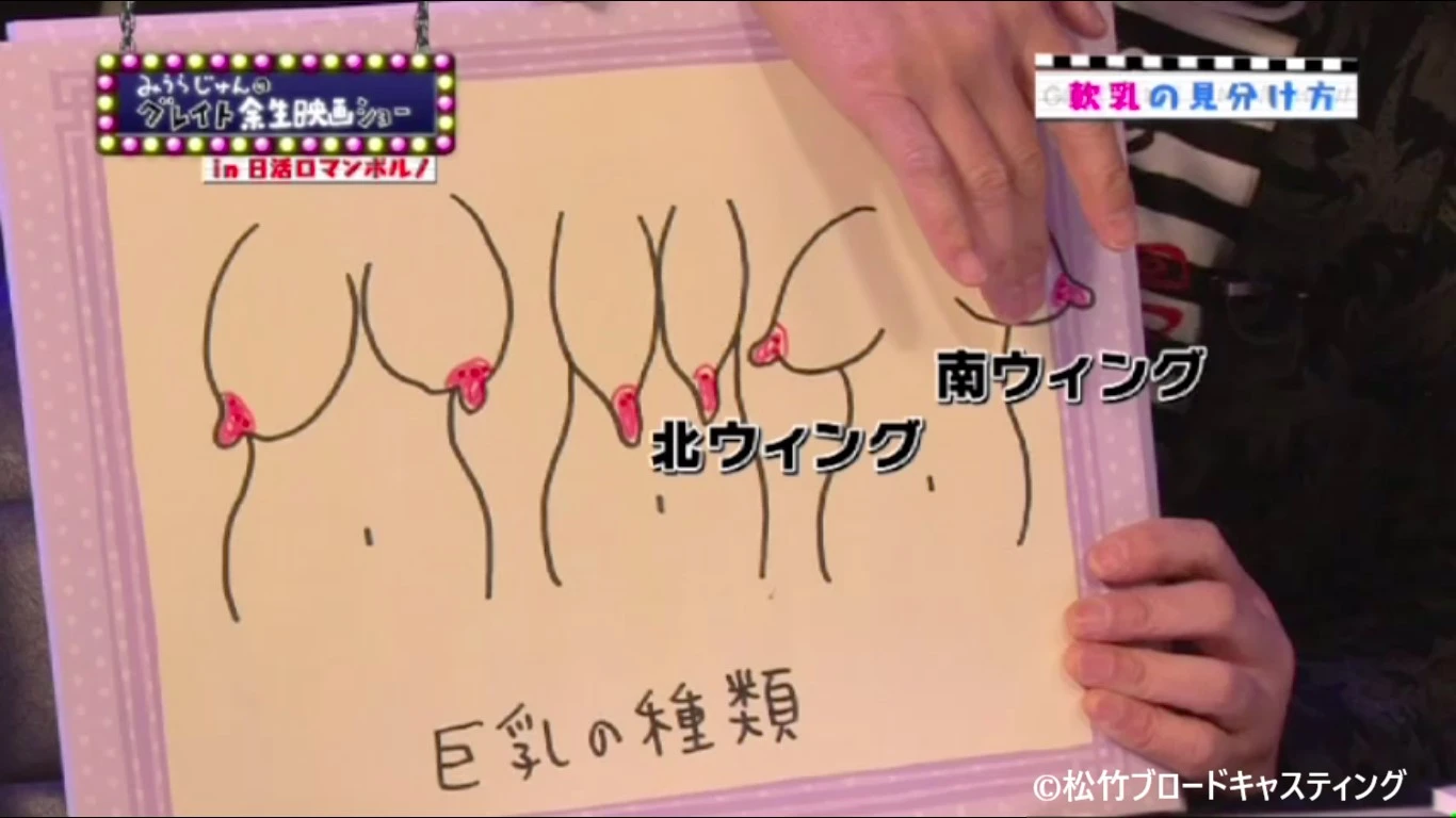 そして、巨乳にも色々種類があるって言う事で、こうなってる人、寝たときに広がりがある人、北ウイングと南ウイングに分かれる感じの人もあります。