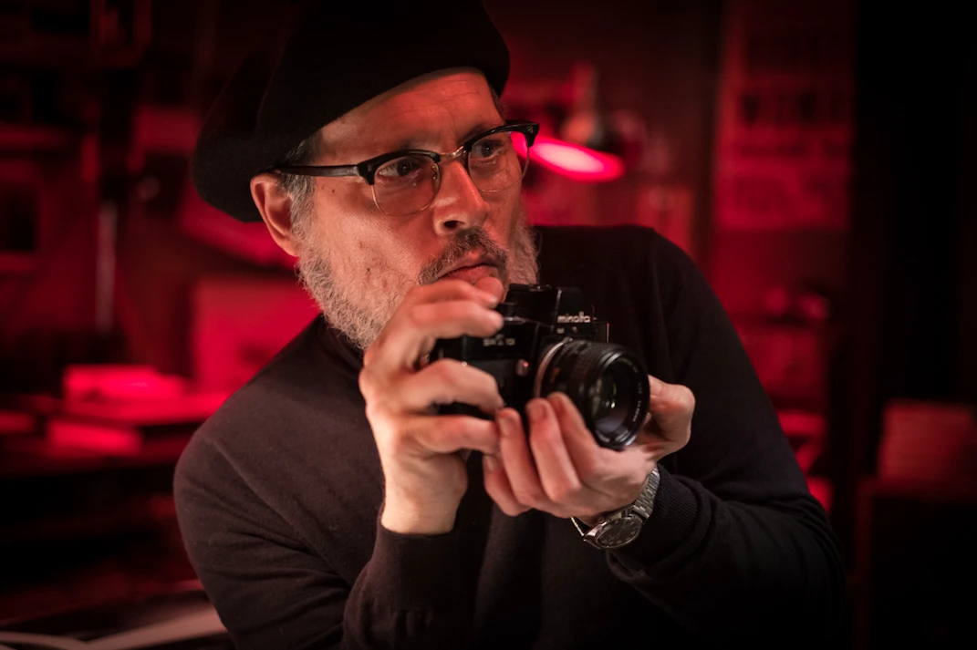 ジョニー扮する W・ユージン・スミスが暗室の中でカメラをかまえた姿。ユージンをよく 知る関係者やファンの中でも、あまりにもそっくりだと称賛を浴びた。© Larry Horricks