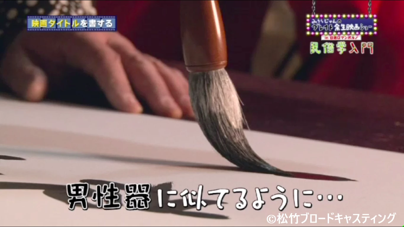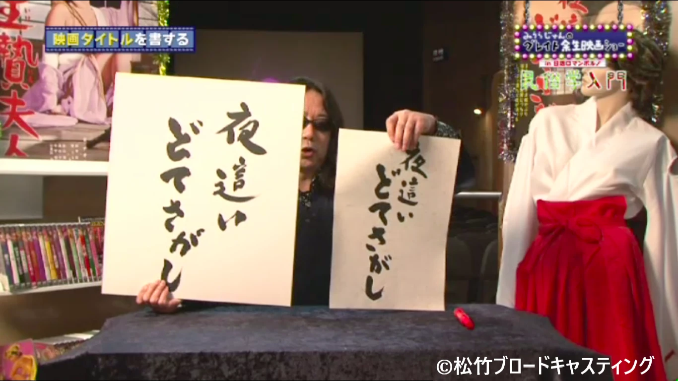 とくに70年代の日活ロマンポルノ作品のタイトルは、書が用いられていることが多いです。このサンプルのタイトルはね、この番組のスタッフの方が、キンコーズで引き延ばしたということです。キンコーズの方はきっと、「変態が来た」と思われたでしょうね(笑)。さあ、その書の数々を、見ていきたいと思います。
