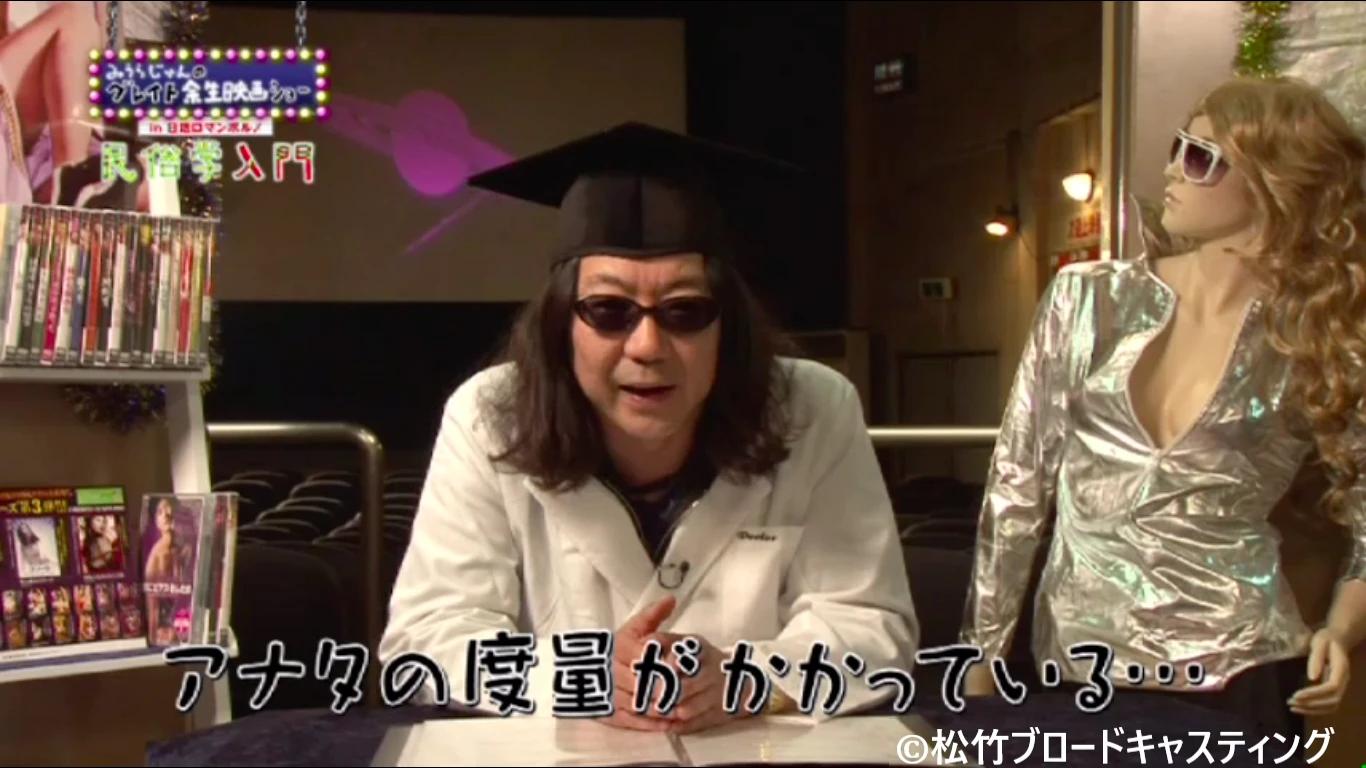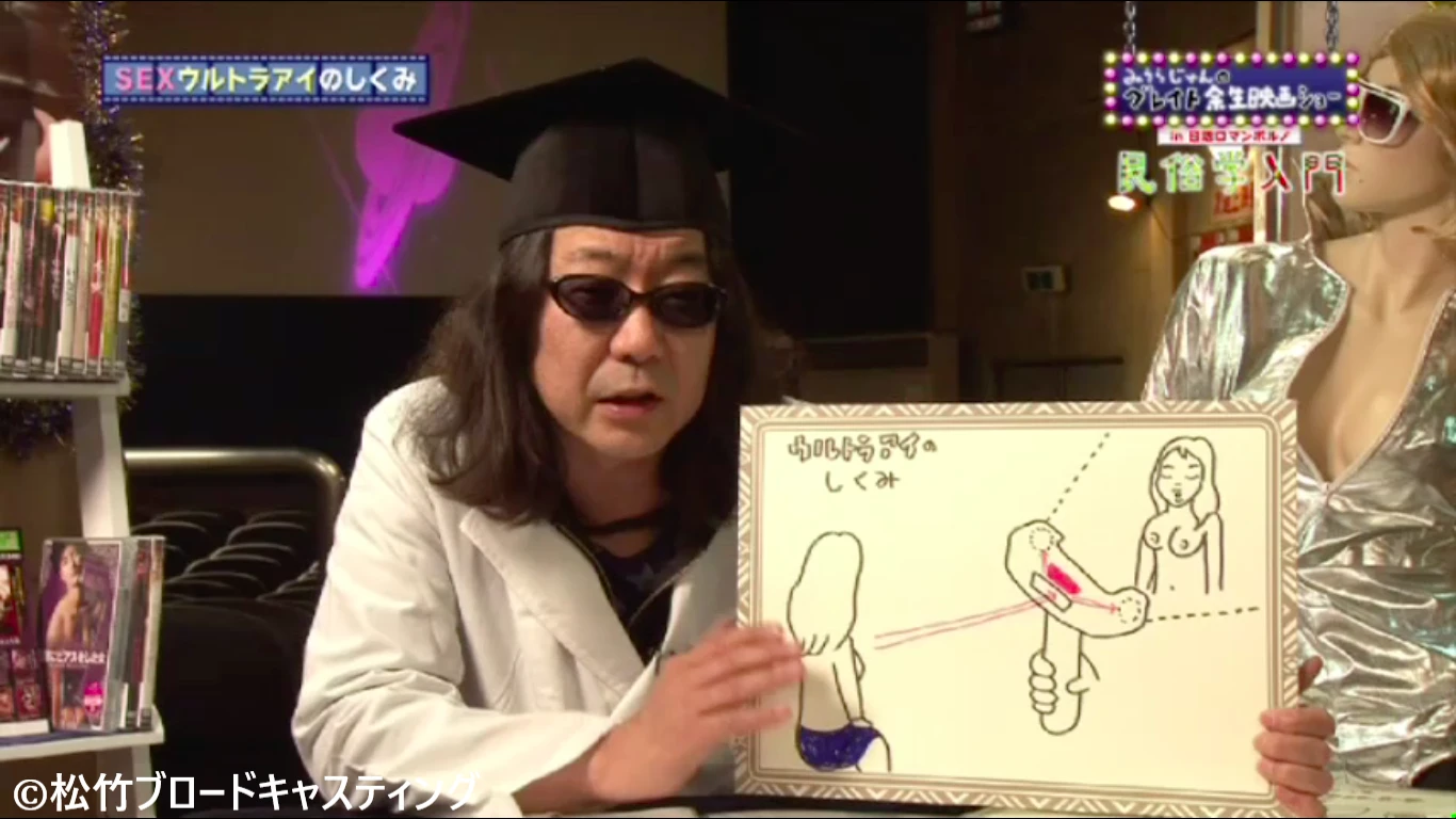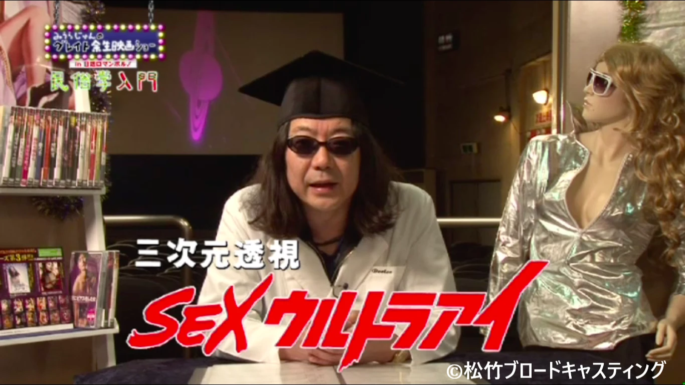 どうも、みうらじゅんと申します。「グレイト余生映画ショー In 日活ロマンポルノ」民俗学入門。今回は、SF特集で、4本お送りします。SFってそもそもなんでしょう?サイエンス・フィクションですよね。でも、実はこの4本全くSFの要素はありませんので、あしからず。でも、このタイトルはどうでしょう? 何か不思議なことが起こるっていることは間違いないです。その代表作、『三次元透視 SEXウルトラ・アイ』。さあこれを、真剣な顔をして見れるかどうか? あなたの度量がかかっているということです。(笑)