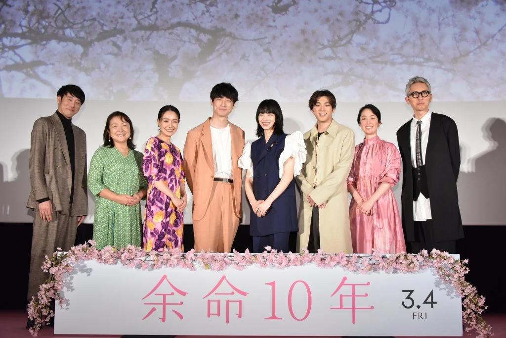 そして、キャスト・監督が熱い想いを込めた本作は小松さん演じる茉莉が余命10年をどう精一杯に生きて愛したかを描いていることにちなみ、【これからの10年間でやっておきたいこと】を答えるコーナーでは松重が【出家】と回答し「この年になってくると余命10年というか、余生10年。色々なことが終わったら、お寺が好きなのでお坊さんになるの良いなって思っています。最初から変化球ですみません(笑)」とキャスト陣も笑ってしまう回答に続けて原は、【ボイストレーニング】と発表し、「歌ってみようかなって。最近やりたいことを我慢しなくなったんです。時間ってあっという間に過ぎてしまう。10年あると、イチから始めても10年後には形になっていると思うので、今から10年後の72歳の時にライブでもやれたら良いなって思っています。まだやりたいことが沢山あるんです」とコメント。黒木の回答は【世界旅行】、「今は色々な所に行けないのですし、体力も落ちていくのでまだ動けるうちに世界を見ていきたいなって思っていて、世界一周とか出来たら良いなって思います」と回答。そして、奈緒は飼っている愛犬の【魚ちゃんとの思い出を沢山作る】で「犬の1日が人の1週間くらいというのを聞いたことがあって、夏には海に連れて行ったり、この間は雪の上を歩かせて固まっていたりと、私は色々知っていますけど、魚ちゃんは何も知らないので魚ちゃんとの初めてをこの10年間で沢山作っていきたいです」と愛犬との思い出作りをしたいと回答した。また山田は【変化を恐れない】と答え、「自分の決めた信念とか、誰かに言われたことを守るのも大切ですけど、変化することで、良い進化が起きる可能性もあるので。そうした良い意味での変化を恐れずに進む勇気をこの10年間で持って一歩一歩進んでいきたいですね」とコメント。坂口の回答は【断捨離】、「ちょうど30歳で、沢山お仕事を頂いて、勝手に変なメッキを付けていることがあるんですよね。10年後はちょうど40歳。それまでに手放せる力が必要かなと思っていて、これからもお仕事をしていく中で、自分に付いてしまったメッキをいつでも捨てられる考えでいられるようにしたいですね」と話すと、最後に小松は【日本一周】と回答、「まず日本を知らないので、日本を知っていくことから始めたい。日本には沢山の魅力がありますよね。そこで会う人とか、色々な話を色々な人から聞きたいです。日本の良いところを知っていきたいです」とコメント。