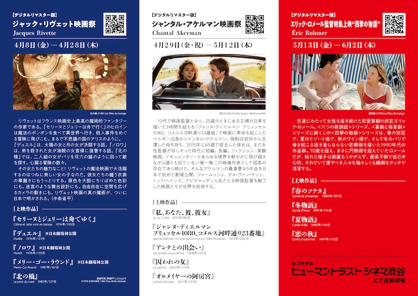 ヌーヴェルヴァーグの中心的人物であるジャック・リヴェットの特集上映【ジャック・リヴェット映画祭】に続き、ベルギー出身の女性映画作家シャンタル・アケルマンの特集上映【シャンタル・アケルマン映画祭】、エリック・ロメールの【エリック・ロメール監督特集上映“四季の物語”】もヒューマントラストシネマ渋谷ほかで順次開催されることが決定した。題して【フランス映画フェスティバル】。全作品デジタル・リマスター版での上映となる。