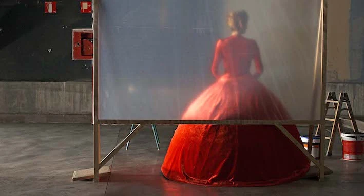 女性がベランダの花にガソリンを撒くシーンから始まる予告編は、不穏な物語を予感させる。バレンシアガの真っ赤なドレスを着たティルダが斧を振りかざすポスタービジュアルもインパクトあり。