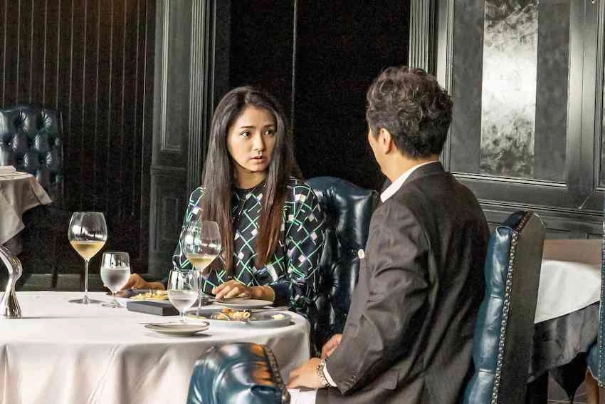 場面写真は、高級レストランで男性と食事する野波麻帆、怪訝そうにどこかを見つめる大鶴義丹、ビールジョッキを握る諏訪太朗、作業着の尾上寛之、白衣姿の黒田大輔を捉えた5枚。彼らは宮松のエキストラ仲間なのか、あるいは宮松の過去を知る人物なのか──。