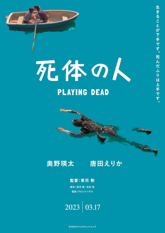 ティザービジュアルはカップルのボートに忍び寄る“溺死体”、メインスチールは頭に草刈り機の刺さった“死体”を捉えたもの。死体のプロたる主人公のおかしみが際立っている。