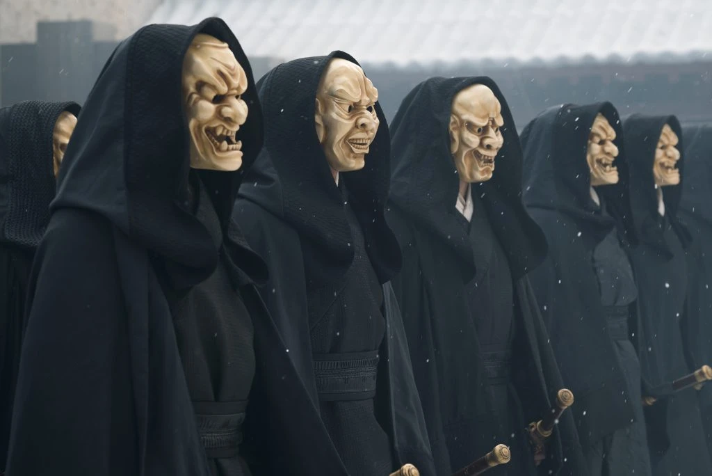 セピアやモノトーンの映像でダークな雰囲気に満ち満ちた陰謀劇が始まるや、次々と登場するキャラクターたちは、とにかくクセがすごい! 王たちに大人しく従うように見せて、それだけのはずはないだろう感溢れるチョウ、通り名は“もの言わぬ狼”! 王よりも貫禄ありありの南陵の王妃・フア夫人、“青の修羅”という通り名を持つ陰のある刺客のユアン。そしてそれ以上に濃ゆいキャラなのが、ユアンと同じ暗殺集団・離恨谷の面々。谷主の金鑼太歳を筆頭に集団で恐ろし気な面をつけているが、いざ戦いの場となって面を外せば、個性バチバチのいぶし銀のおじさま揃い(かっこいい姐さんも!)。煙管をくゆらせ登場するイケオジの鬼愁判官、スキンヘッドで強面の怪葵山鬼、一本の傘が一陣の黒い風のように形を変える奇怪な武器・陰陽傘で無敵の戦いを見せる黒無常など、名前の字面もすごいが刺客たちの存在感もすごい。彼らが宝の地図をめぐって熾烈なバトルを繰り広げる。