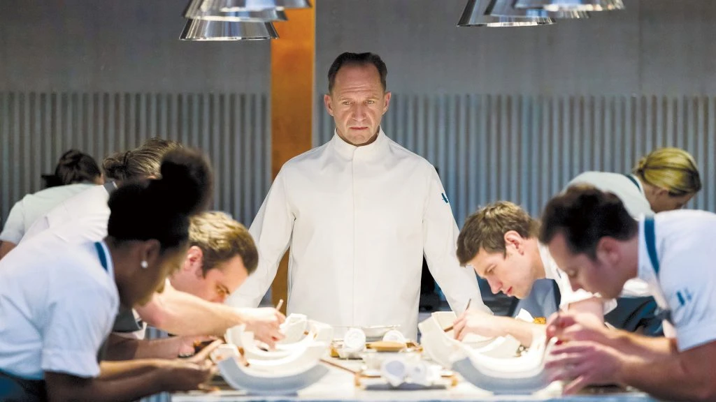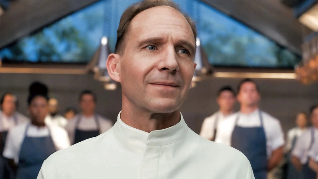 1品目「島(ホタテ)~私たちは一瞬の存在~」に始まり、料理は客に提供される前に必ずシェフの“演説”が入る。なぜこの料理は生まれたのか? そこにはどんな想いが込められているのか? 抑揚のある声で朗々と語るスローヴィクを演じるレイフ・ファインズが放つ、他者に四の五の言わせない存在感がすごい。シェフの“特別なサプライズ”が隠された料理を出された客たちは、わかったような顔でウンチクを並べながら絶品料理の数々を喉に流し込んでいく。しかし、4品目「混乱(ヒレ肉、ポテト、ビーフソース、骨髄、野菜)~安らかにジェレミー~」が運ばれてきてから事態は急転する。