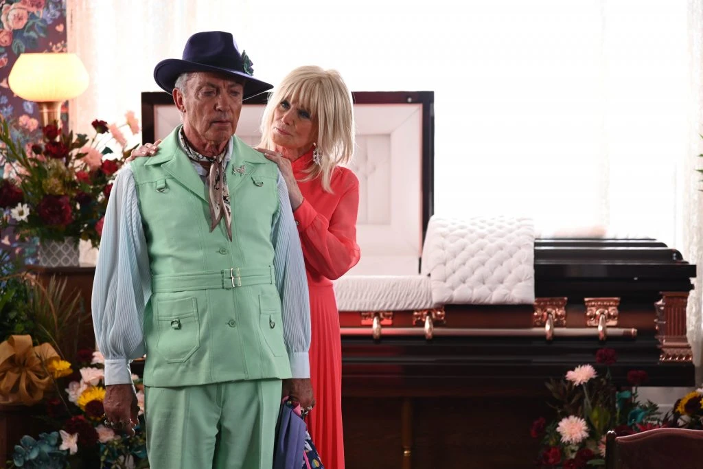 街はずれにある老人ホームから中心地までは長い道のりなのだが、パットの足取りは軽やかで楽し気だ。当初、グレーのスウェット姿で頑固で厄介そうな老人にしか見えなかったパットだが、街に戻り、リタの死化粧のための道具を調達しようと右往左往するなか、次第に何やらカワイイおじさんと化していく。行く先々で出会った老若男女誰とでも馴染み、もらったピンクの帽子を茶目っ気たっぷりにかぶったかと思えば、洋服屋からはとっておきの緑のスーツをプレゼントされ、それを粋に着こなしたパットはゴージャスだった現役時代を彷彿とさせるまでになる。