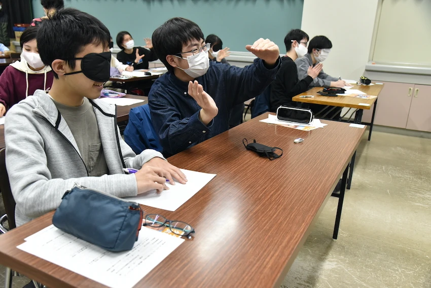 体験後、生徒たちは「実際に描くとなると、直線を書いても、どこにその線があるのかわからないし、『〇を描いて』と言われても『どこから?』という感じで……」「ガイドが『12時』とか『3時』などと時計の針で表すのは合理的なんだなと実感しました」などと感想を述べた。