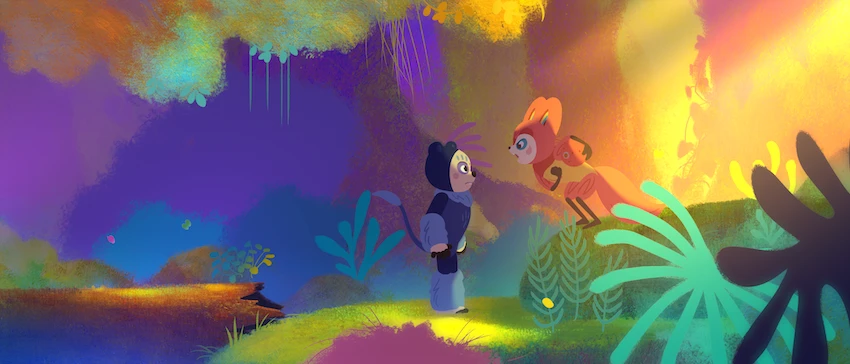 場面写真は、色鮮やかな森にいるクラエとブルーオを捉えたもの。アブレウ監督は“色彩と線の魔術師”と評される画家パウル・クレーの「本当は、色が私たちを支配しているのであって、その逆ではない」という言葉に触れ、「紙の上で、次にコンピューター上で実験を重ねて最も意味のある色の組み合わせが生み出された。さまざまな色に照らし出された“神秘の森”は、すべてが可能で、しがらみのない、自然やすべての生きものとの繋がりを見出す場所だ。美しくいくつもの色で描かれた、子ども時代を象徴する空間(森)は温かく、優しい」と語っている。