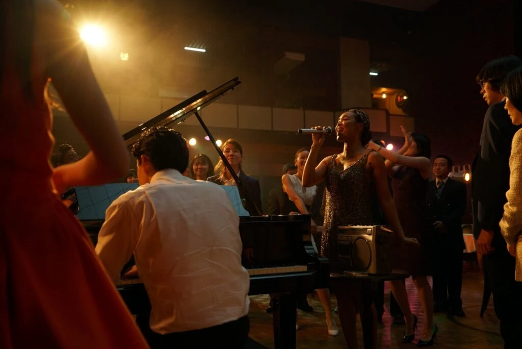 また、ジャズを題材にした映画の真骨頂という点で、演奏シーンの数々も見逃せない。池松演じる博と南のピアノはもちろん、圧巻はクリスタル・ケイやサックス奏者である松丸契らが音と歌声を重ねていく、ヤマ場でのアンサンブル。ジャズをこよなく愛する冨永監督が、映像表現によって音楽本来の魅力と魔力とエナジーを視覚化した、まさしく珠玉のワンシーンかと。それでいて、ミュージシャンの性(さが)と矜持も浮き立たせるという、名人芸の域にまで昇華させている。言わずもがな、キャスト陣の名演あっての名シーンではあるが、撮影部や録音部、照明部に美術部といったスタッフ陣ともども息を合わせて完成度を高めたことは、想像に難くない。
