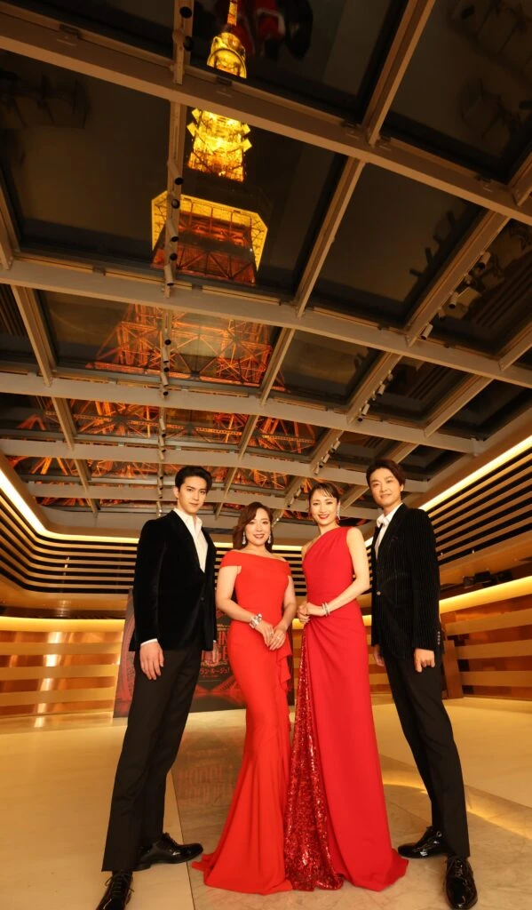 赤、赤、赤の世界――ド派手で煌びやかなステージセットのイメージとぴったりな、ライトアップされた夜の東京タワーのふもとで、今年6月20日から9月にかけて再演される『ムーラン・ルージュ!ザ・ミュージカル』に出演する望海風斗と平原綾香(サティーン役Wキャスト)、井上芳雄と甲斐翔真(クリスチャン役Wキャスト)の4人が、トークセッションを行った。