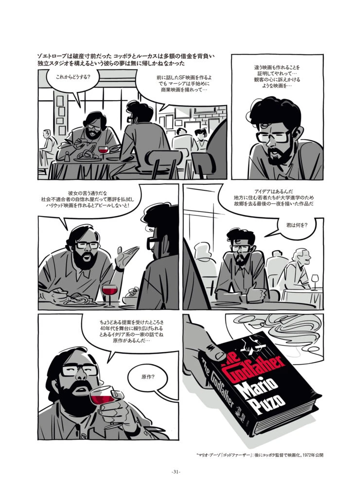 いまや映画業界における伝説ともなっている「ジョージ・ルーカスの生い立ち」と「スター・ウォーズ誕生までの舞台裏」が、ついに明らかに! ルーカスの成功物語は、たとえ当たり障りのない話だけで構成しても十分に興味深い話だし、後進のアーティストにも参考になる要素は多々ある。だが、今回、一編のコミックとしてまとめられた本書には、己の理想と夢を実現するために奮闘を続ける者たちの苦悩に満ち、しかし一方では形になりつつある夢の実現に興奮と震えを感じながら邁進を続ける姿が、ありのままに描かれている。そこがいい。そしていつの時代でも、時代に変革をもたらすような作品が誕生する背景には、こうした人間臭い物語が存在していたのだ。これこそが、我々が待ち望んでいたものであり、ジョージ・ルーカスを感じる上で絶対に知っておかねばならない物語である。(河原一久)