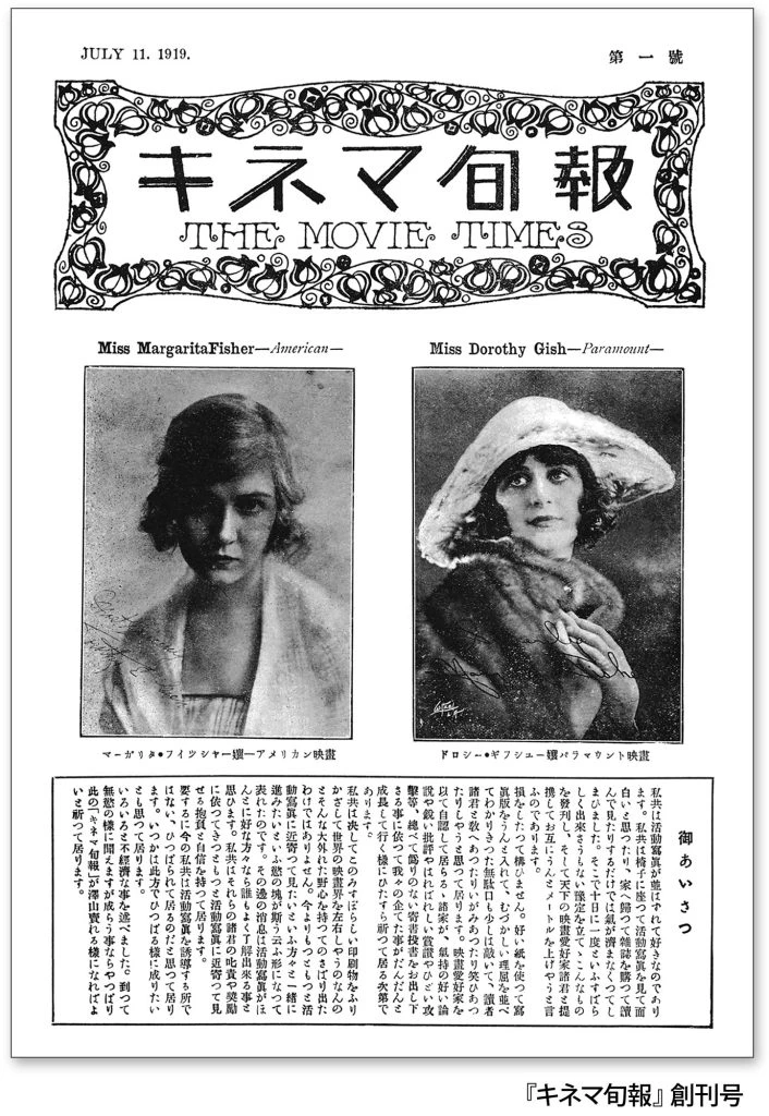 1919年『キネマ旬報』創刊号は印刷部数500部で総ページ数が4ページ、B4サイズのアート紙を二つ折りにした、いまと変わらぬB5版で発行されました。