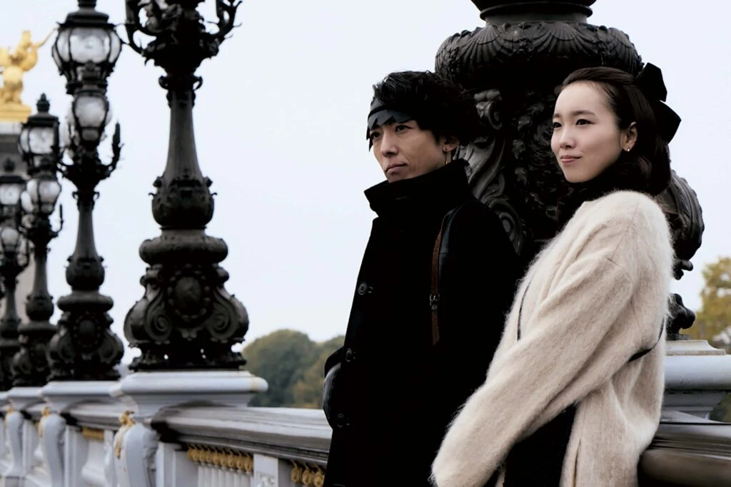 トレードマークとなる黒のレザーヘアバンドに、ペン先を模した革靴姿の露伴と、スタイリッシュな黒のレザーのドレスを纏った京香も、フランスの街並みに自然と溶け込む一方で、たとえ江戸時代まで一気に時代が遡ろうとも、違和感なく観られてしまう和洋折衷の妙。ドラマ放送時から大いに話題となった露伴が暮らす邸宅(葉山加地邸)や、青年期の露伴が過ごした祖母が管理する元旅館の風情ある下宿アパート(東山温泉向瀧)。そして美術オークションの会場となった横浜ホテルニューグランドなど、魅力的なロケ地にも目を奪われる。
