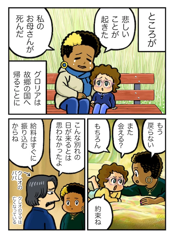 突然の別れに戸惑うクレオを、グロリアは自身の子どもたちもいる母国の家へ招待する。そして夏休み、クレオは再会できる喜びを胸に、ひとり海を渡ってグロリアのもとへ──。