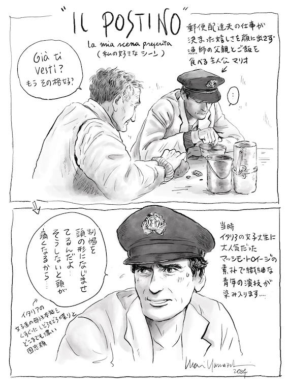 郵便配達の青年マリオを演じたマッシモ・トロイージは、心臓に病を抱えながら撮影に臨み、クランクアップの12時間後に41歳で永眠した。到着したイラストは、配達人に採用されてすぐ制帽を被るマリオに、父親が「もうその恰好?」と突っ込むシーンを描いたもの。
