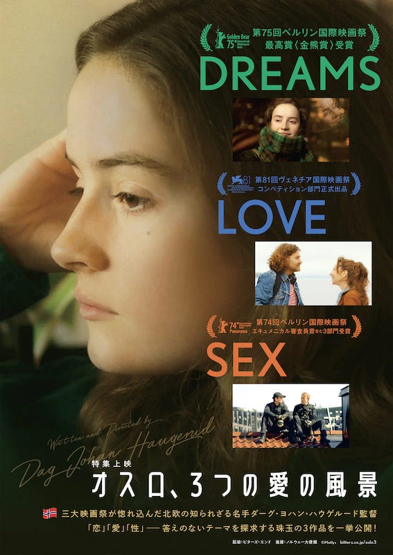 初恋の手記から3世代の女性の価値観を浮き彫りにし、第75回ベルリン国際映画祭で金熊賞に輝いた「DREAMS」。現代の多様化した恋愛の形を考察し、第81回ヴェネチア国際映画祭コンペティション部門に出品された「LOVE」。性のありようを再考し、第74回ベルリン国際映画祭でエキュメニカル審査員賞など3部門を受賞した「SEX」。オスロの印象的な景色とともに紡いだ珠玉の物語群に注目したい。
