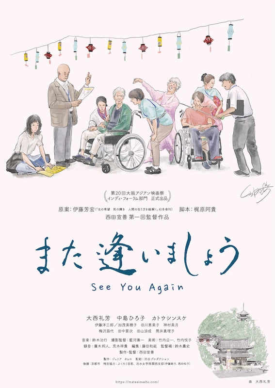 京都市右京区でデイケア施設〈ナイスデイ〉を運営する伊藤芳宏の著書『生の希望 死の輝き 人間の在り方をひも解く』を原案に、介護施設の人間模様を描いた「また逢いましょう」が、7月18日(金)よりアップリンク京都とシネ・ヌーヴォで、7月19日(土)より新宿K’s cinemaほか全国で順次公開される。主演の大西礼芳(「嵐電」「初級演技レッスン」)が自らイラストを描いたポスター、漫画家クロネコポンチとして描いた劇中漫画、さらに予告編が到着した。