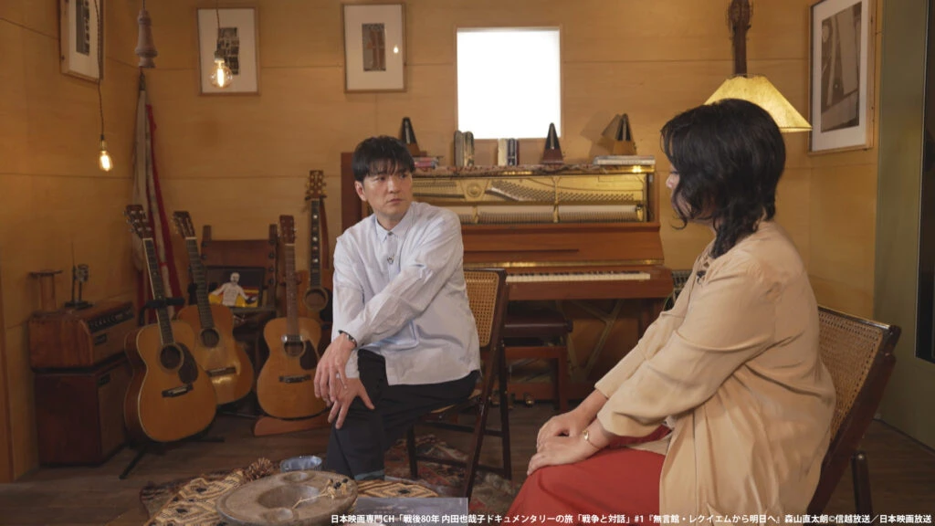 阿武野:「作品のセレクションもそうですが、一番難航したのは対話相手を選ぶことでした。政治的なことや戦争に関することに触れるのを避ける傾向が、特に芸能界では拡大しています。特に何でも自由に話していそうなお笑い界は壊滅的でした。今回出てくださったゲストは、日々、きちんと自分の意見を言い、表現をされている方たちです。#1のゲスト・森山直太朗さんは、也哉子さんと以前から懇意にされているということもあるんですが、歌詞の中に現代をどう見ているのかという独特の視点があります。お忙しいのに、実際に無言館へも足を運んで、也哉子さんとの対話に臨んでくれました。二人の対話を聞いていると、信州の風が吹いているような爽やかさがありました」