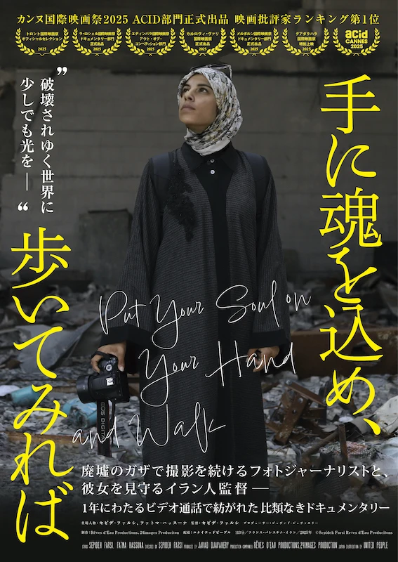イスラエルによるガザへの攻撃が続いていた2024年。イラン出身の映画監督セピデ・ファルシは、緊急で現地の人々の声を届ける必要性を感じていた。だがガザは封鎖され、足を踏み入れられない。そうした中で知り合ったのが、ガザ北部に暮らす24歳のパレスチナ人フォトジャーナリスト、ファトマ・ハッスーナだった。監督はファトマとのビデオ通話を軸にした映画を作ろうと決意し、画面越しの交流が始まる。ファトマは監督がガザを知るための目となり、監督はファトマと外の世界との架け橋となっていった──。両者の約1年間にわたるビデオ通話を映画化した「手に魂を込め、歩いてみれば」が、12月5日(金)よりヒューマントラストシネマ渋谷ほか全国で順次公開される。ポスタービジュアルが到着した。