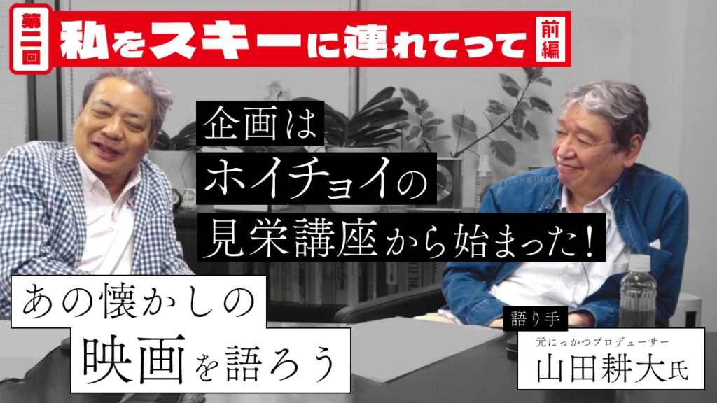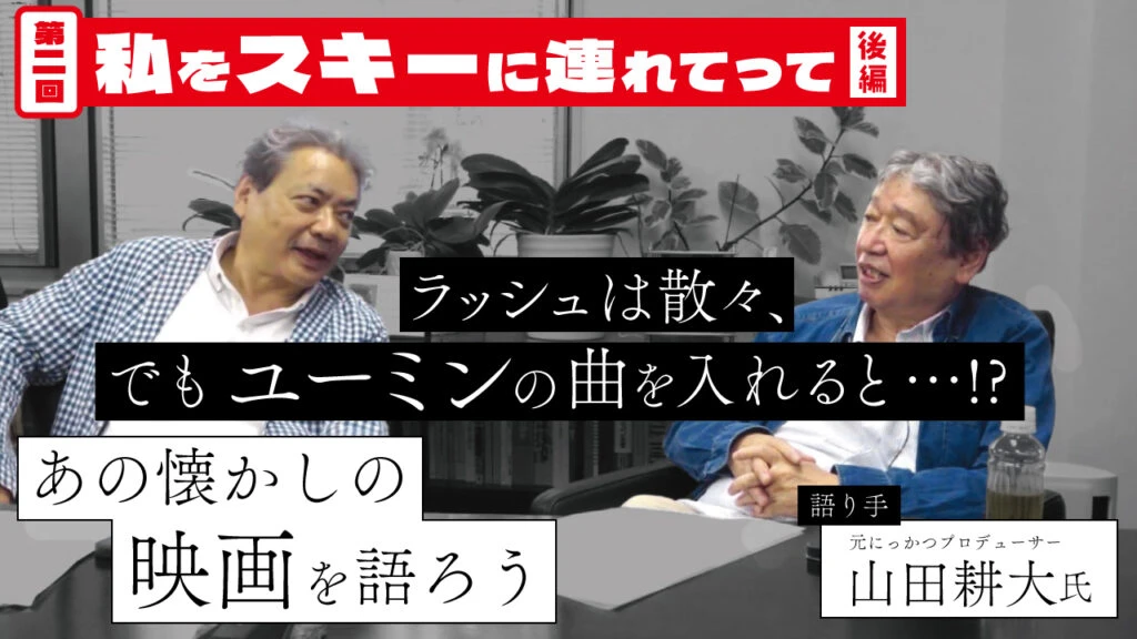 今回は語り手の山田耕大氏だけでなく、聞き手として同席するにっかつ時代の後輩の平田樹彦氏(現・ダブルフィールド代表取締役)にとっても思い出深い1作。当初の企画発案者として、山田氏と一緒に馬場康夫氏に会ったことや、脚本を務めた一色氏のスキーの指南役として作品作りに関わっていたというエピソードも飛び出し、大いに盛り上がる──。
