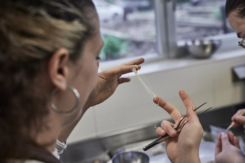 毎年11~4月には休業し、スタッフ総出でメニューを開発することでも知られるムガリッツ。カメラが追うのは試食会の日の厨房で、スタッフはブラシやスポイト、ヤスリなどを駆使して繊細な調理を施していく。やがて客人の前に運ばれてきたのは、〈指で食べる納豆〉〈茶葉で飲むスープ〉など遊び心に富んだ料理だ──。